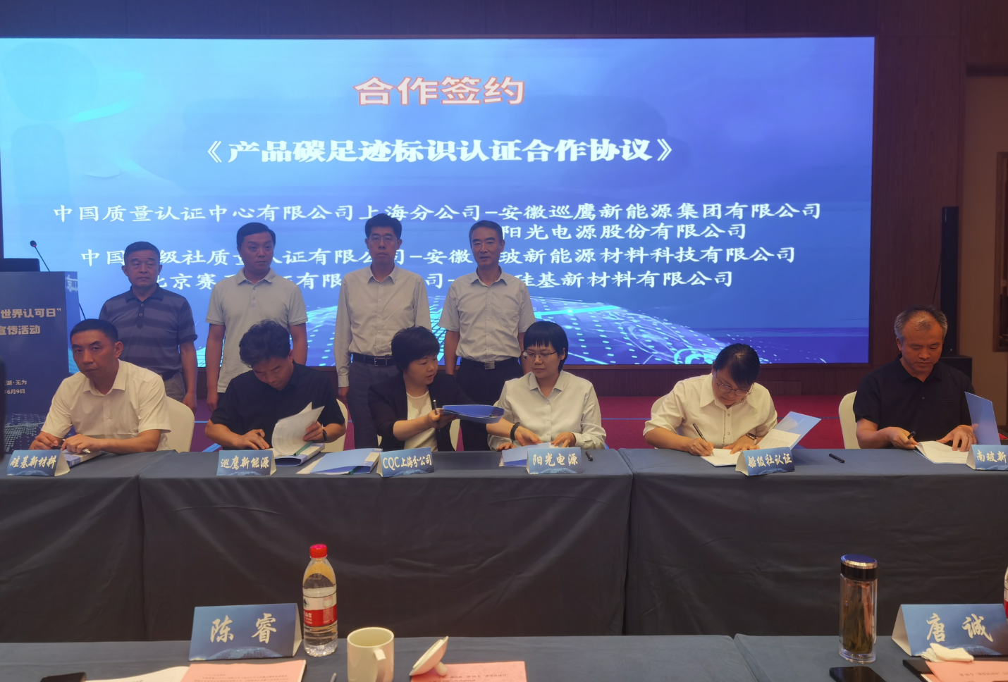 会上,在安徽省市场监督管理局副局长陈睿、省局认检处处长刘春生、芜湖市市场监管理局党委书记、局长唐诚和市局副局长程锐等领导的共同见证下,安徽分公司总经理王艳艳与安徽南玻新能源材料科技有限公司授权代表现场签订了产品碳足迹标识认证合作协议。此次签约标志着双方在该领域的合作正式启动。