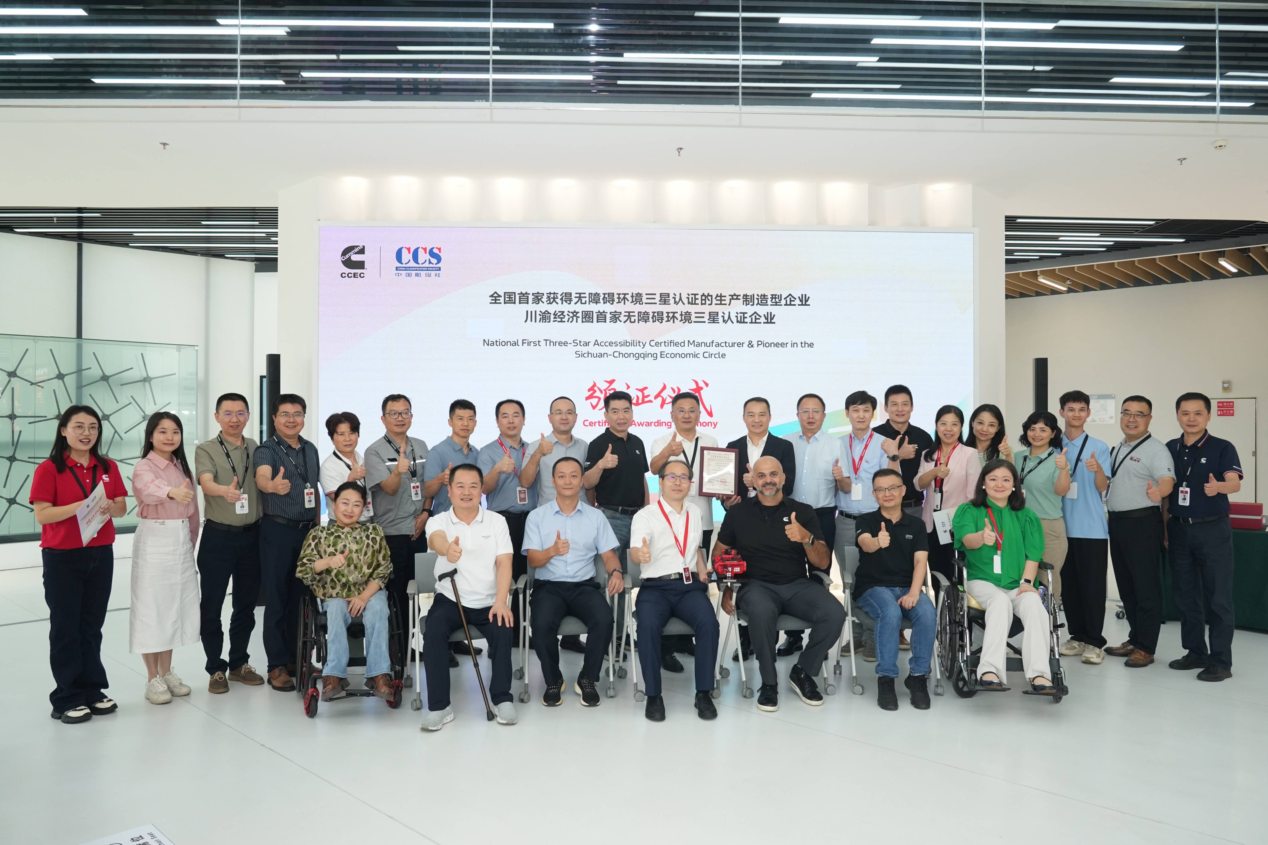 9月25日,我司受邀参与重庆康明斯发动机有限公司办公大楼无障碍环境认证三星级证书颁证仪式,重庆市残联、重庆市市场监督管理局、渝中区无障碍环境促进协会、中国船级社重庆分社参加本次活动。我司副总经理付治深出席颁证仪式并进行主题发言,重庆分公司相关人员陪同参加。