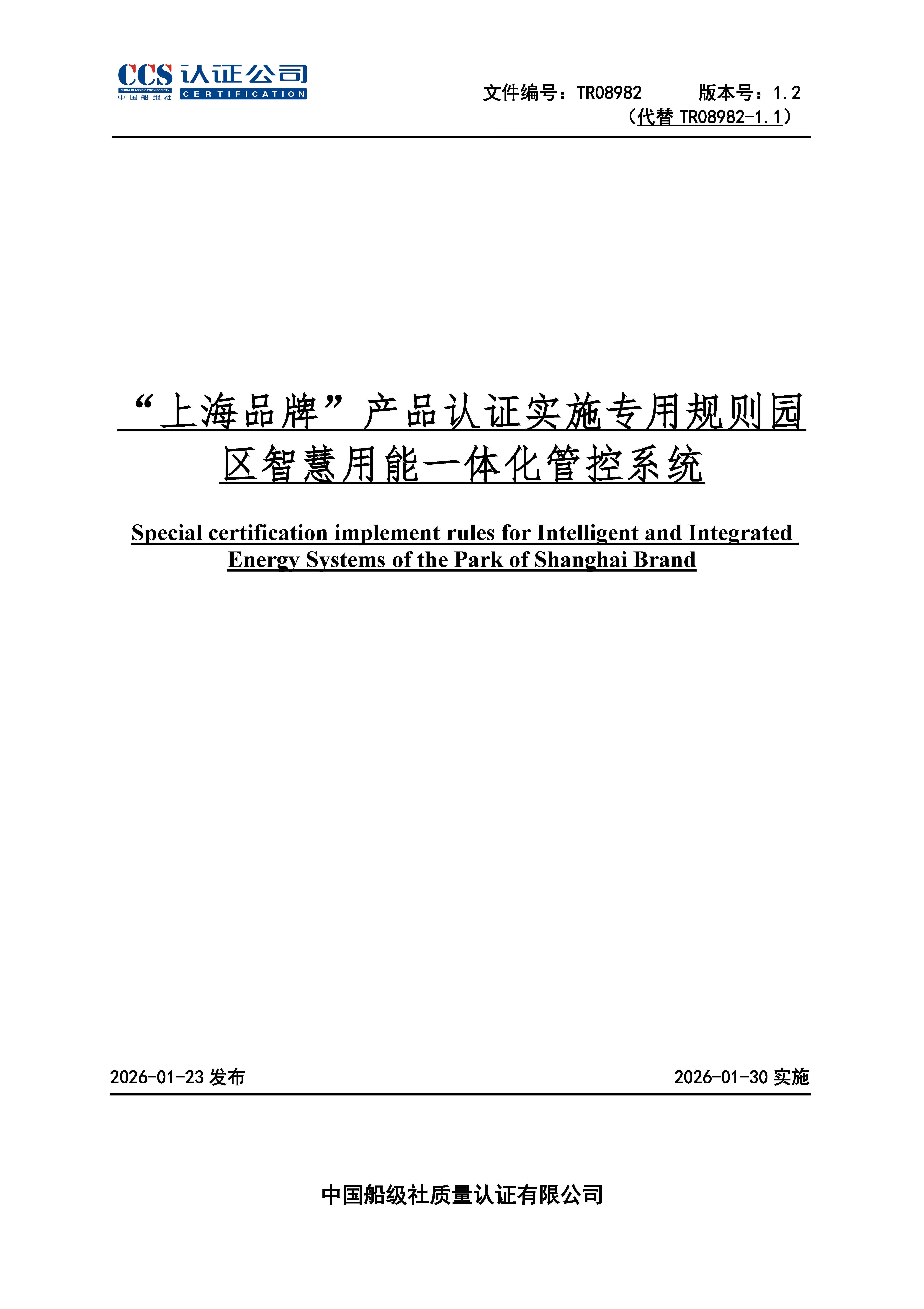 TR08982-1.2“上海品牌”产品认证实施专用规则园区智慧用能一体化管控系统