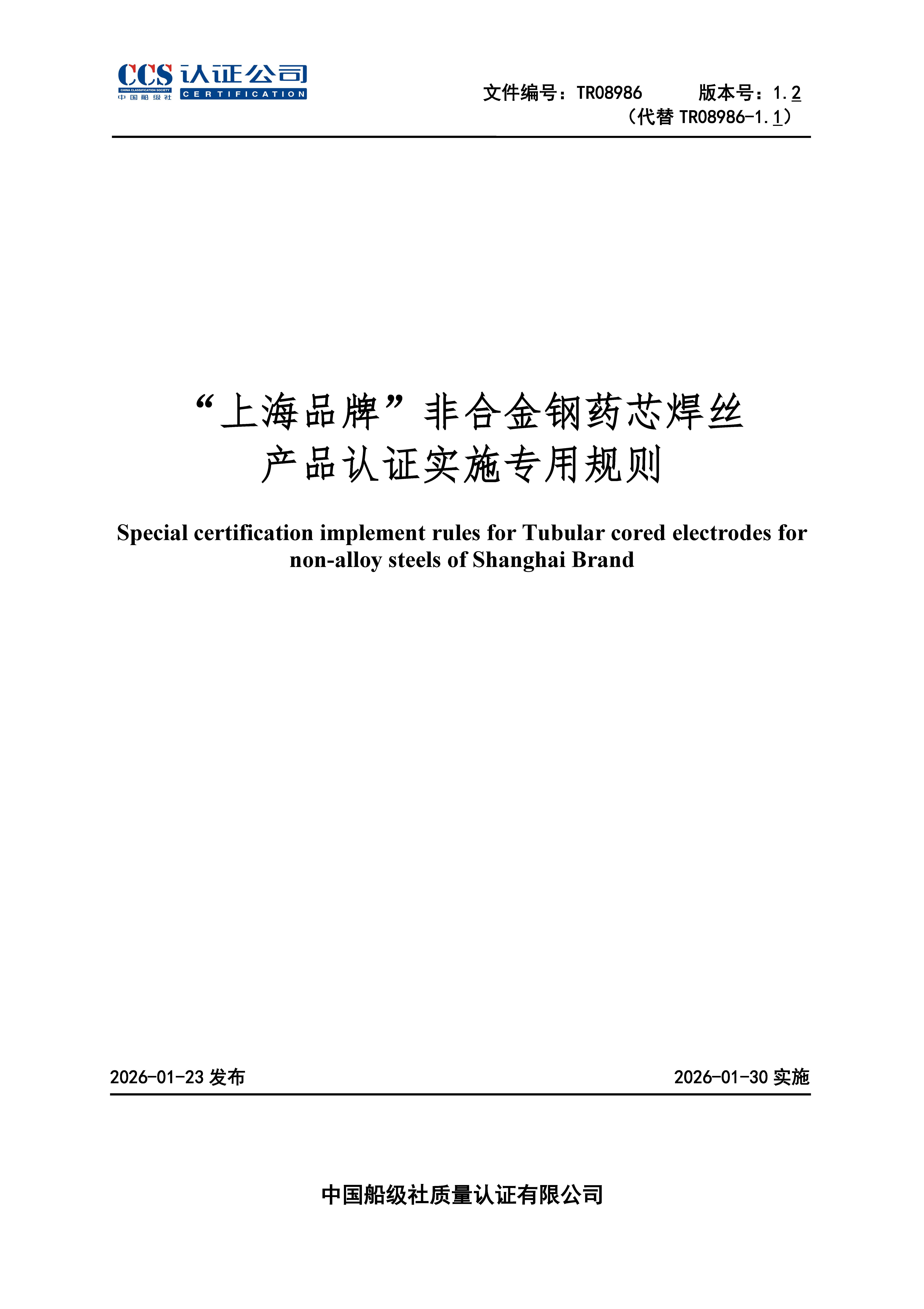 TR08986-1.2“上海品牌”非合金钢药芯焊丝产品认证实施专用规则