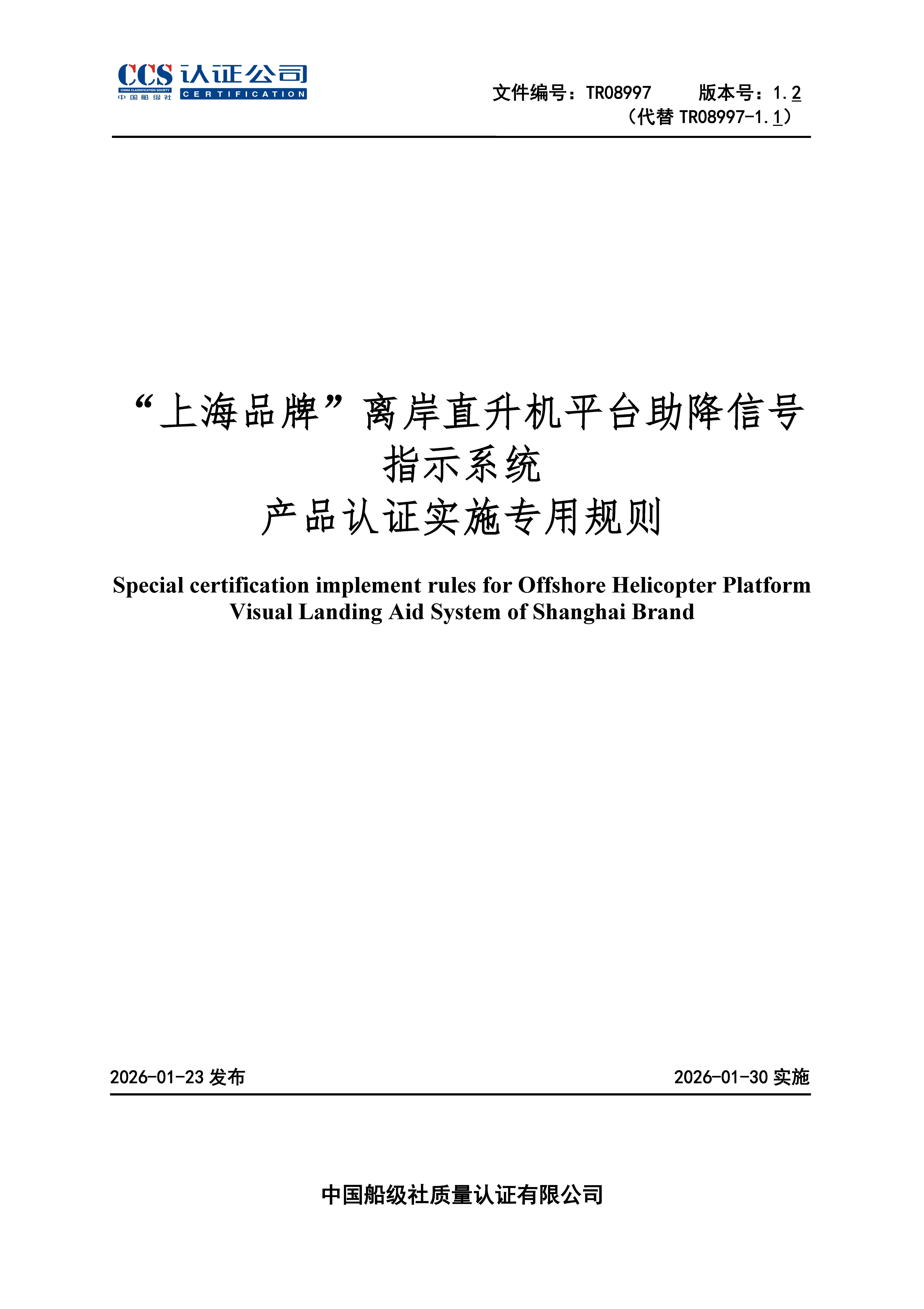 TR08997-1.2“上海品牌”离岸直升机平台助降信号指示系统产品认证实施专用规则