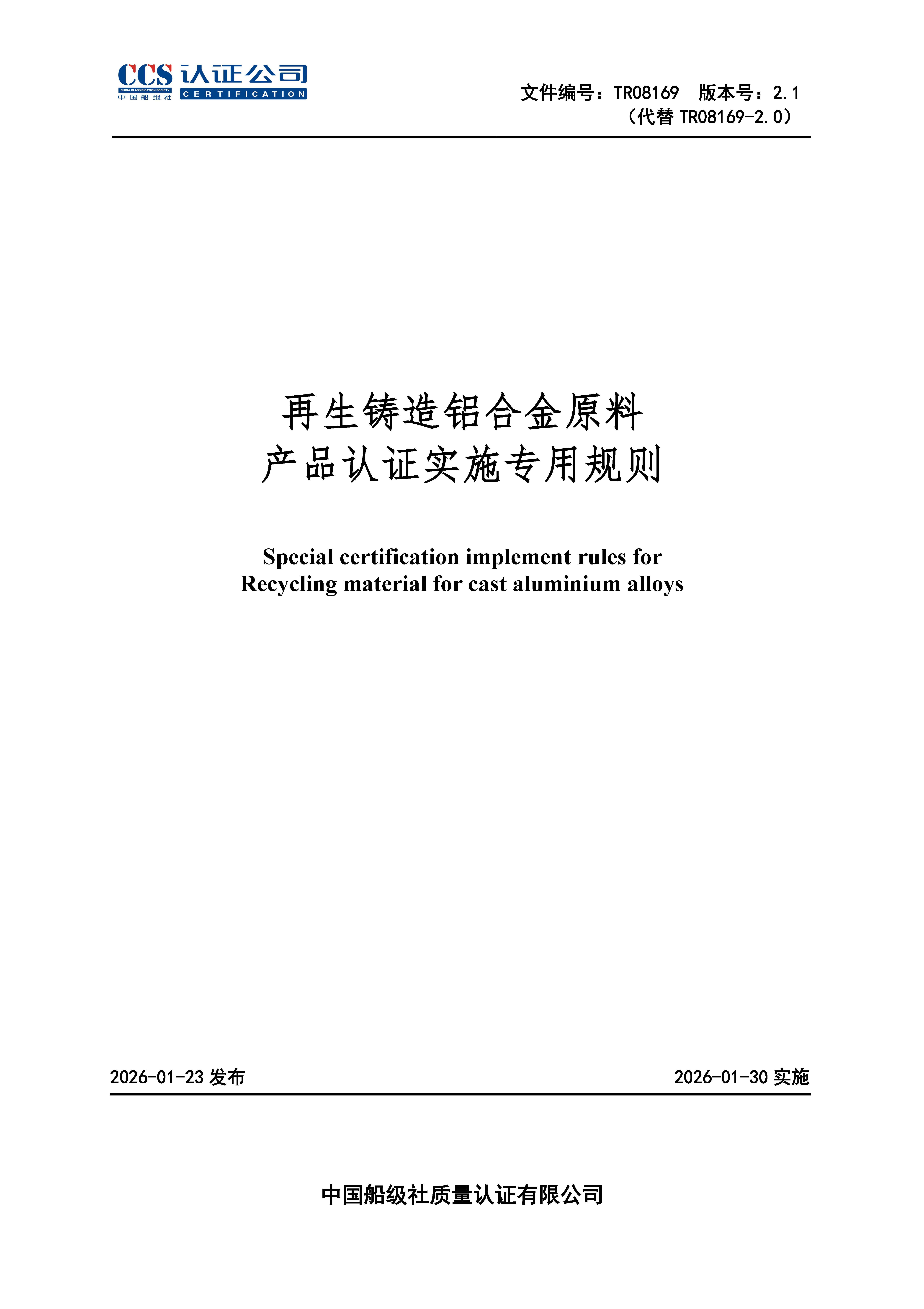 TR08169-2.1 再生铸造铝合金原料产品认证实施专用规则