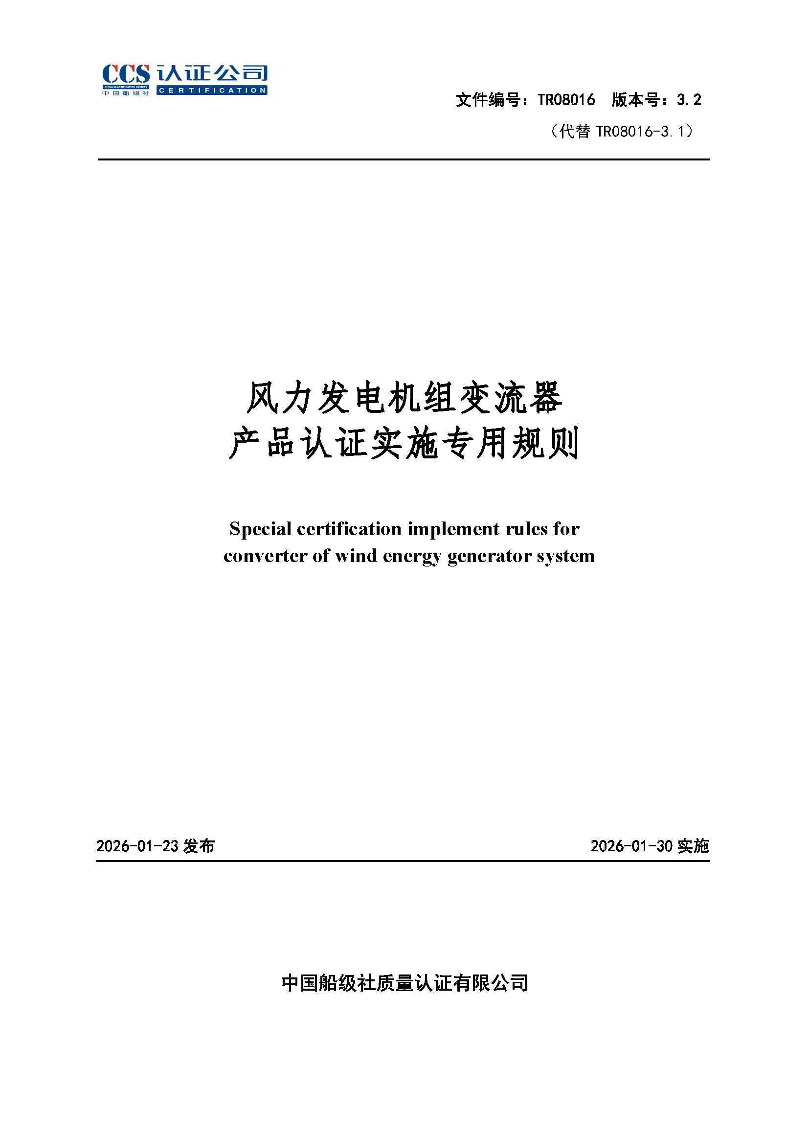 TR08016-3.2 风力发电机组变流器产品认证实施专用规则