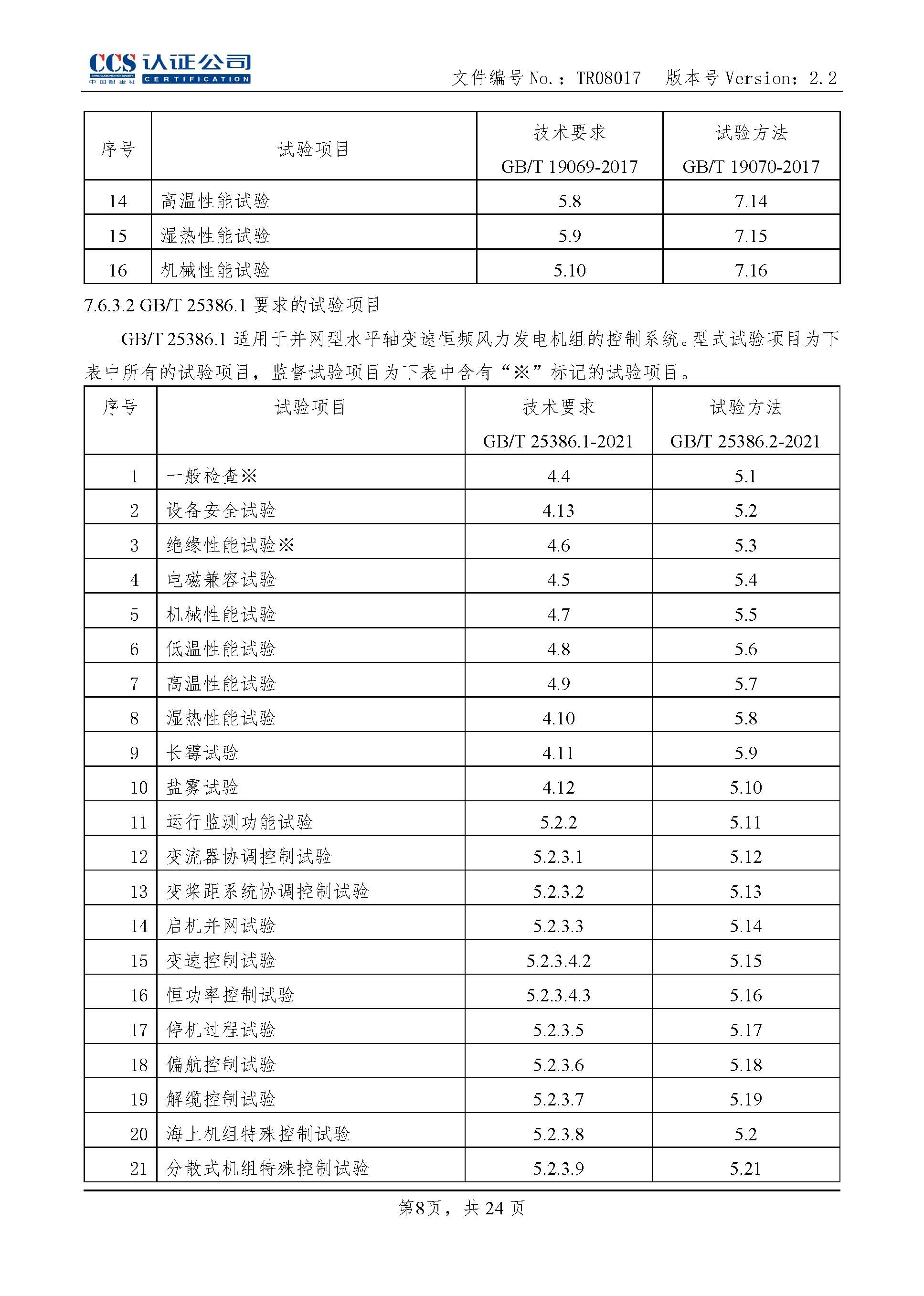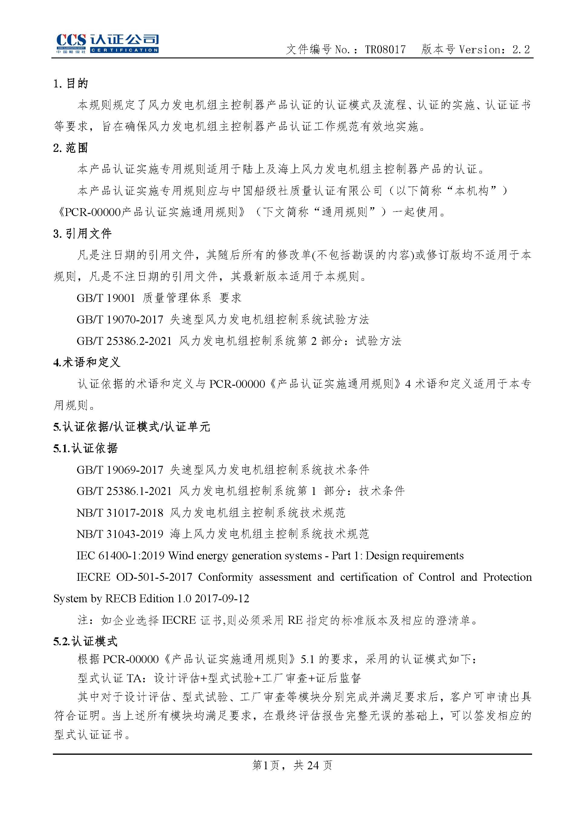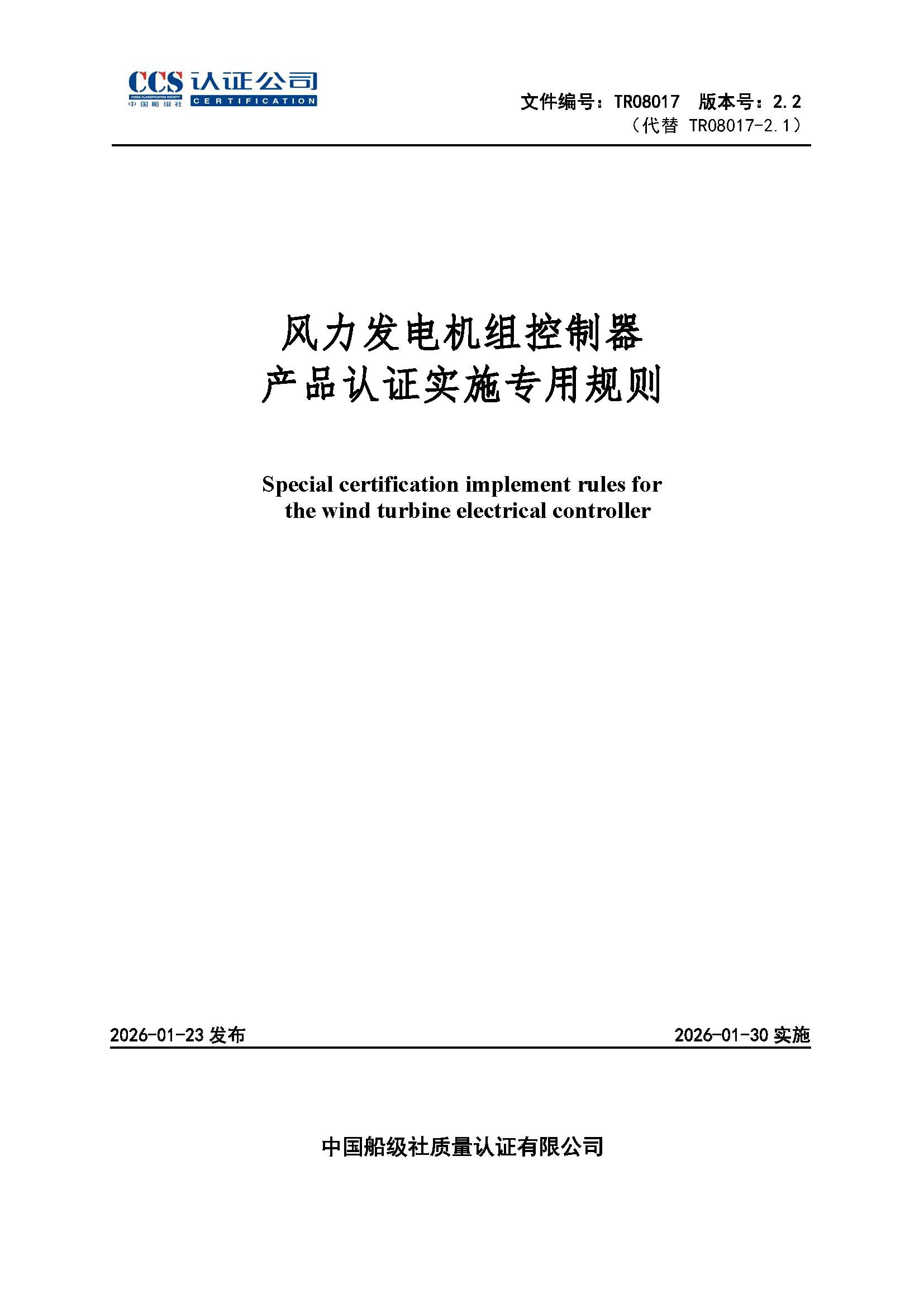 TR08017-2.2 风力发电机组控制器产品认证实施专用规则