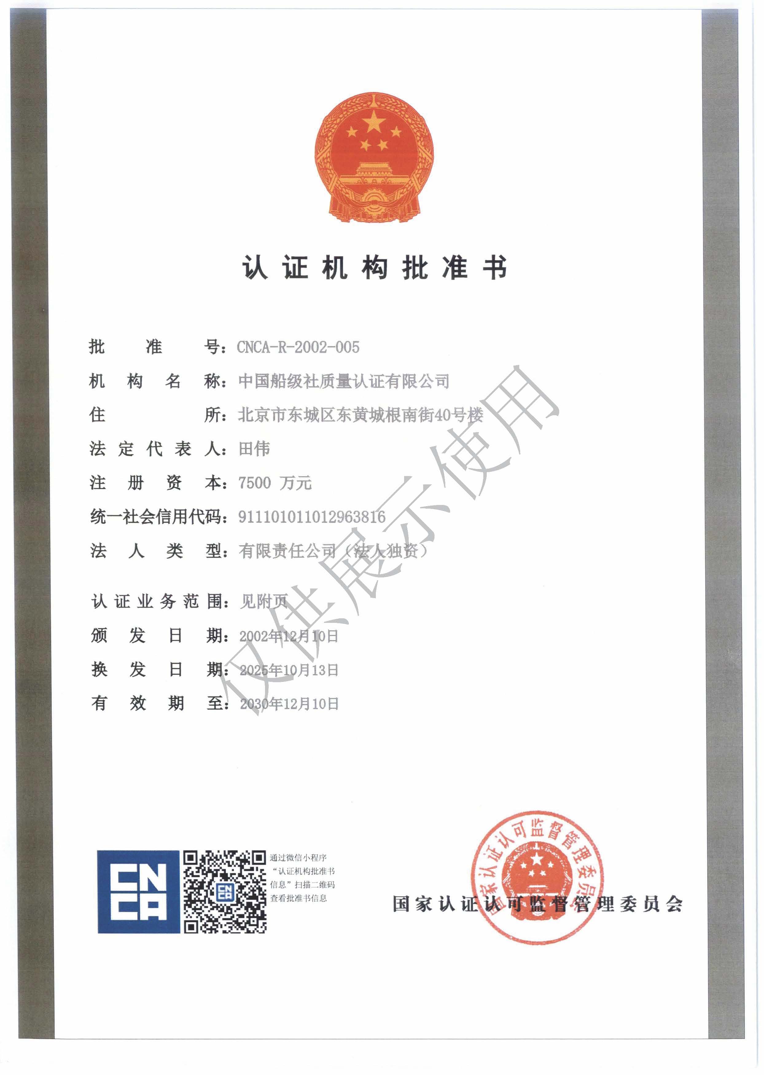 认证机构批准书